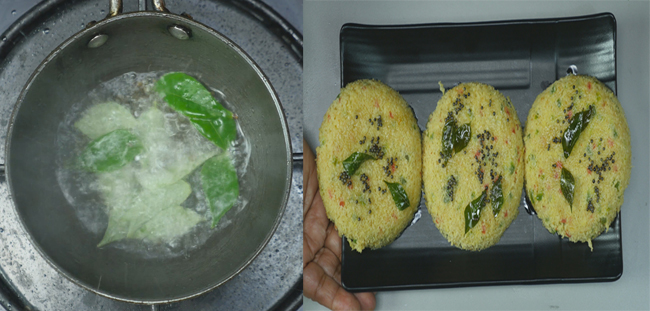 Add 6-7 curry leaves to the oil and add Tadka over the idlis. Oats idlis are ready to be served.