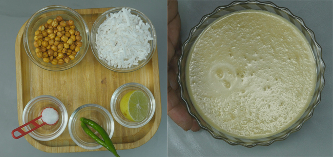 Meanwhile, prepare coconut and chickpea chutney for idli. Take 1/2 cup of grated narial, 1/4 cup of roasted chana, 1/2 tsp of salt, 2 green chilies, 1/2 lemon juice, 1/4 cup of water and blend everything.