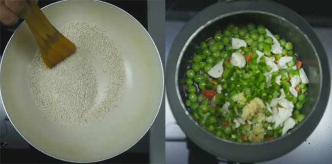 Now, add 1/2 cup of peas, 1/4 cup of chopped carrots, 1/4 cup of chopped cauliflower, 1/4 cup of chopped capsicum, 1 tsp of grated ginger, 1-finely chopped green chili to the cooker and saute them lightly.