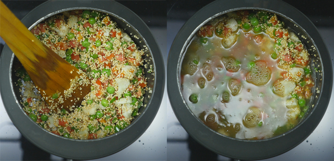 Add roasted Jau Dalia to the veggies and saute for 1/2 more minutes. Add 1-chopped tomato after roasting Jau as we don't want it to be mushy.