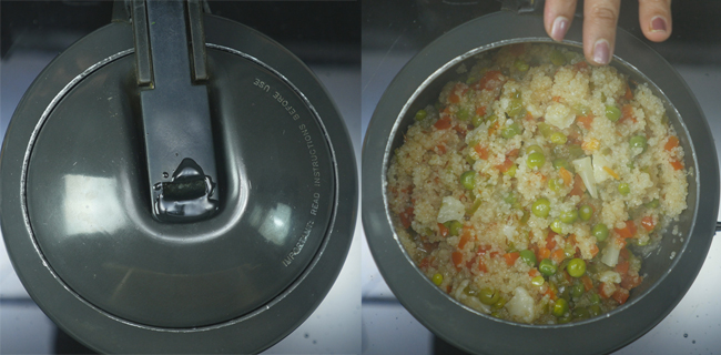 After a whistle, switch off the heat and wait for the cooker's pressure to clear. Once the pressure settles, leave the pulao partially covered for 10 minutes.