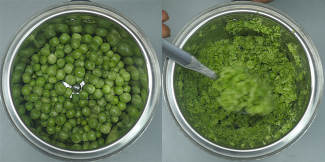 Turn the flame low to avoid burning of spices. Add coarsely ground green peas, 3/4 tsp of salt, 1/2 tsp of crushed red chili, 1/2 tsp of dry mango powder, 1/4 tsp of garam masala, and sauté everything over the low-medium flame for 1-2 minutes.