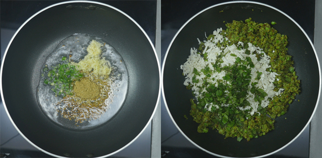 Take 1 cup of green peas and grind them coarsely. Take a Kadai and heat 2 tbsp of oil in it. When the oil is hot, add 1/2 tsp of cumin seeds, 1 tsp of grated ginger, 2-chopped green chilies, 1 tsp of coriander powder, and sauté everything briefly.