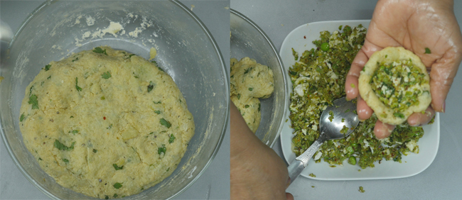 Apply oil to your hand and make balls of the stuffing. Take a dough portion, make it round, and give it a shallow bowl shape. Add 1-stuffing ball and cover it while collecting the corners.