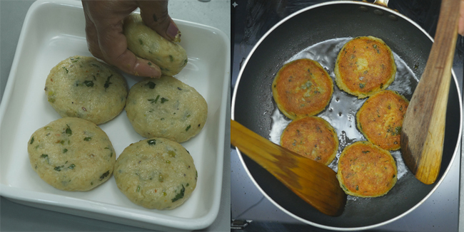 Take a flat pan and heat 2-3 tbsp of oil in it. Keep the flame medium. Add prepared patties to the pan, and shallow fry them in medium hot oil.