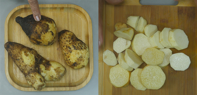 Thoroughly wash and dry 3 Garadus/yams. Apply oil to your hand and peel the black cover of the yams. Slice the yams into 1/2 inch thick slices.
