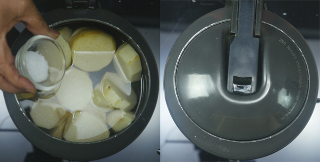 Put yam slices in the cooker to cook. Add 1 cup water, 1 tsp of salt to the pressure cooker and cook the yams for a whistle. Turn off the heat after a whistle and wait for the cooker's pressure to clear.