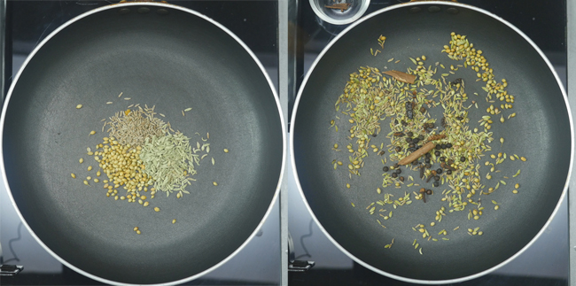Add 1/2 tsp of black pepper, 1-cinnamon stick, 4-cloves, 2-black cardamom seeds to the pan and dry roast everything for another 1/2 minute. Turn off the flame, add 1-pinch hing, and mix well.