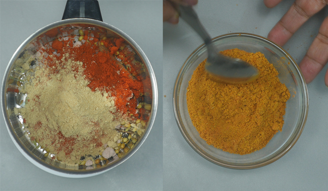Once the spices cool down, put them in the food processor and add other spices too. Add 1/2 tsp of turmeric powder, 1 tsp of salt, 1 tsp of black salt, 1 tsp of sugar, 1.5 tsp of red chili powder, and 1/2 tsp of ginger powder to the food processor and grind into a fine powder.