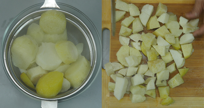 Transfer the yams to the strainer from the cooker and drain out the water. Pour fresh water over the pieces of yams and wash them. Take the yam pieces out on a board and allow them to cool down.