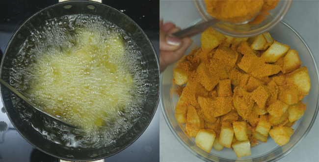 After a few minutes, stir the yam pieces and fry them till golden brown from all sides. Fry all the yam pieces similarly; each batch will take 10 minutes to fry up nicely.