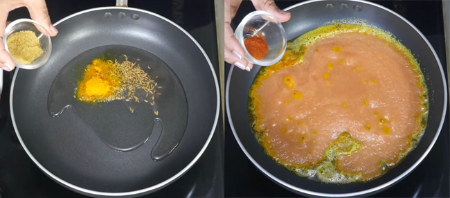 Prepare a paste of 2 tomatoes, 1-green chili, and 1/4 inch ginger and add to the pan. Add 1/2 tsp of red chili powder and roast the masala till the oil separates.