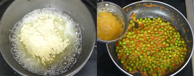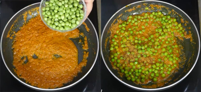 Add 1 cup of green peas and 3/4 tsp of salt when the masala is slightly roasted. Cover and cook the sabzi for 5 minutes over low heat.