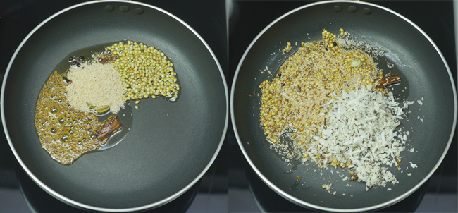 Start with roasting the spices for preparing kat. Add 1 tbsp of oil, 1 tsp of cumin seeds, 1-inch cinnamon stick, 2-green cardamoms, 2-cloves, 7-8 black pepper, 1-black cardamom (seeds), 1 tbsp of coriander seeds, 1 tbsp of poppy seeds to the pan, and roast lightly.