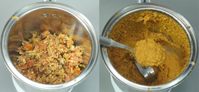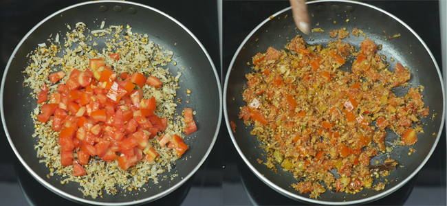 Stir the tomatoes after 2 minutes and cook covered for another 2 minutes. Oil is separating from the masala, it is cooked and ready. Leave the masala to cool down. Meanwhile, prepare pithi (stuffing) for Vadas.
