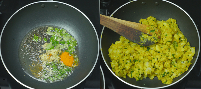 Add 2-3 tbsp of green coriander to the potatoes and mix well. Within 5 minutes of roasting, the stuffing is ready. Turn off the heat and keep it aside for a while.
