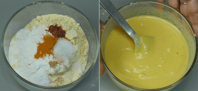 Pour some water and prepare a lump-free mixture first. Then, add water gradually and prepare a pouring consistency batter. Leave the batter for a few minutes.