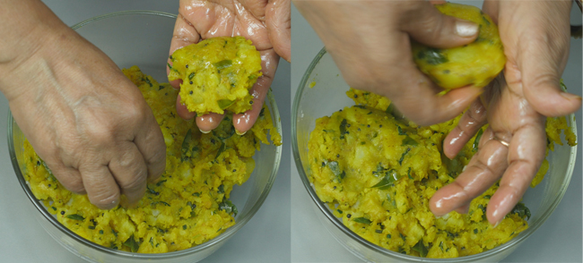 The Potato mixture is cool enough, let us prepare vadas from it. Apply a little oil to your hand, take out a little mixture, make it round, and press to flatten it like Tikki. Likewise, prepare Tikkis from the whole mixture.