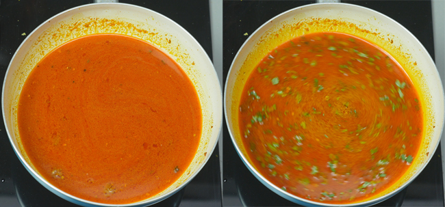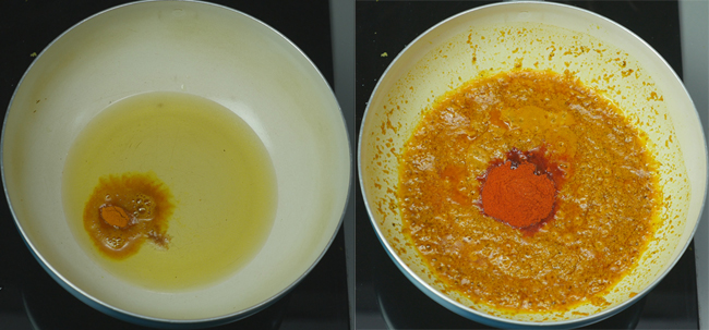 Add 1/4 tsp of turmeric powder, 1/2 pinch hing to the Kadai, and roast briefly. Add blend tomatoes, 2 tbsp water (shaken in mixer jar), and saute the masala over medium heat. Add 2 tsp Kashmiri red chili to the masala and fry till the oil separates.