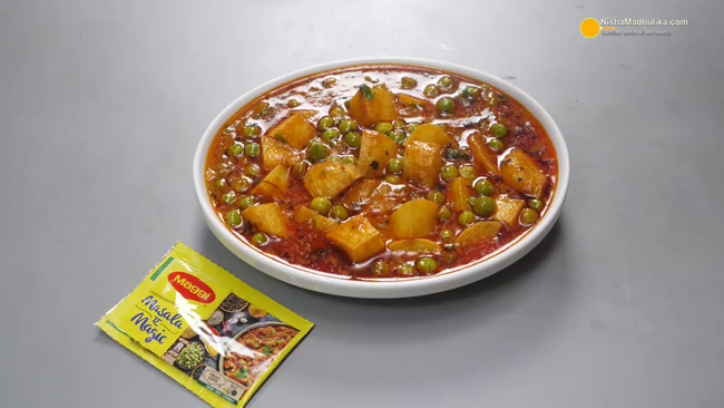 Today we are going to make aloo matar malai with gravy, something different from aloo matar sabzi. It is very easy to make and the ingredients to make it are available in your kitchen. It is very tasty, also to give it a spicy taste, we will add Maggi's Masala-e-Magic to it. So you too make this delicious gravy aloo matar malai and enjoy its taste.