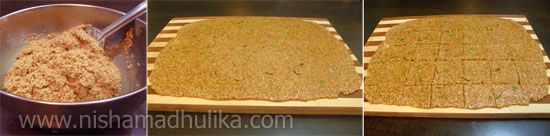 Grease the roller with ghee and roll out the mixture increasing its size in the same shape. Cut the rolled out patti with a knife in desired shape. Let the patti cool down.