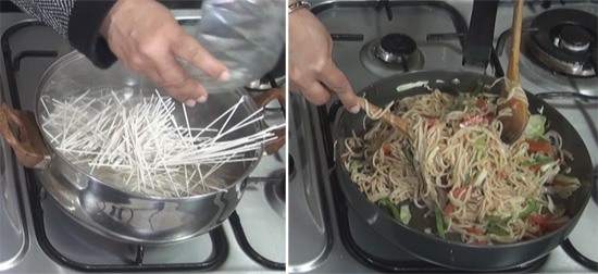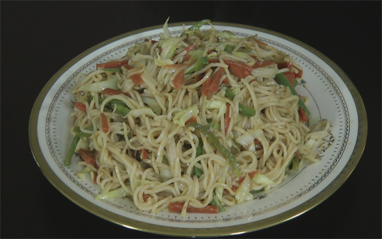 For noodles with onion : finely chop 1 onion, fry in hot oil till it turns light pink and now cook as you add the vegetables. Prepare Vegetable Chow mein by following the above method. Chop spring onions and sprinkle over the noodles.