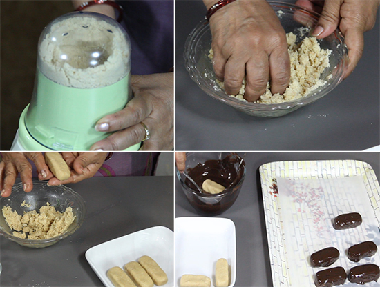 Now take little amount of mixture in your hands, press it gently in your hands and give a long square shape. You can also set it in a plate (like barfi) and then cut into square shape. Like wise prepare peanut bars from rest of the mixture and place them in a separate plate. After this place peanut bars in a fridge for 10 minutes so that they get set.