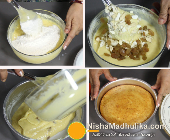 Add dry ingredients like maida and baking powder in condensed milk and mango pulp. Whisk the batter rigoursly until all lumps get dissolve. Also add milk, cashews and raisins in the batter. Batter for making cake is ready
